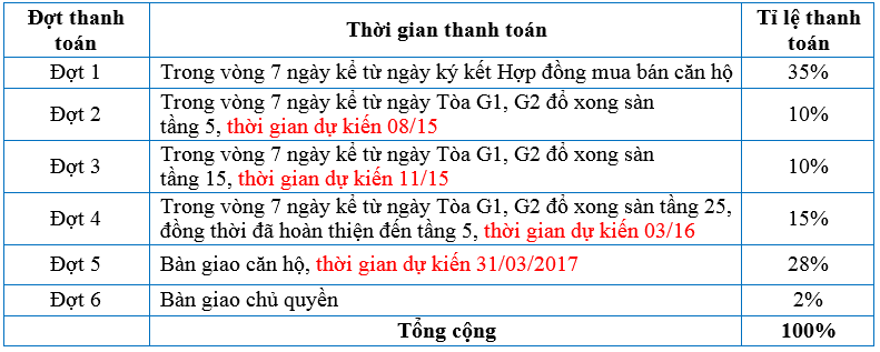 Tiến độ thanh toán tòa G1 & G2 Five Star Kim Giang